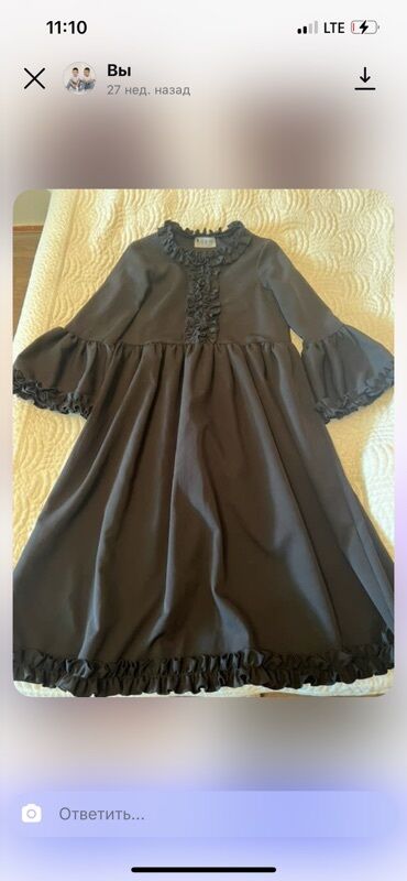 3) Тёмное платье с воланами: свободный А-силуэт до миди, круглый вырез. Декоративные рюши по горловине, по центральной планке и по низу. Рукава 3/4 с воланом. Комфортная посадка и романтичный стиль.