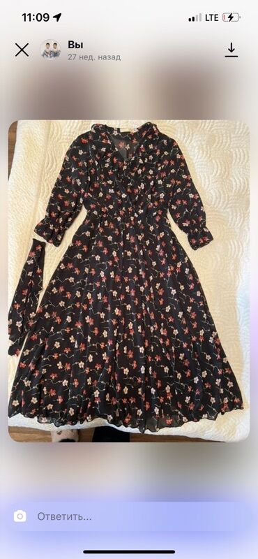4) Платье на чёрном фоне с цветочным принтом: длина миди, приталенная посадка с поясом из той же ткани, длинные рукава на манжете. Яркий принт с крупными розами, аккуратный круглый вырез. Плотная ткань держит форму.