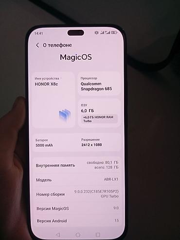 - Память: 6 ГБ оперативной + до 6 ГБ HONOR RAM Turbo, встроенная 128 ГБ (свободно ~80 ГБ).
