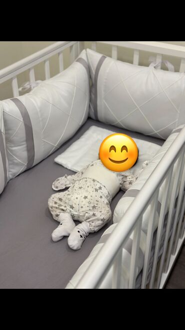 Продается детская кроватка, 1 сторона опускается, качается, снизу полка выдвижная, в комплекте матрас, бортики на завязках, подушка для малышей, 2 наматрасника(серый и белый)