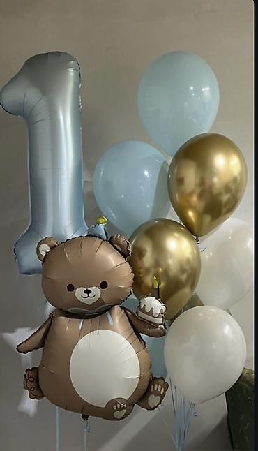 - Фольгированный шар‑фигура «мишка с тортиком» на грузике.