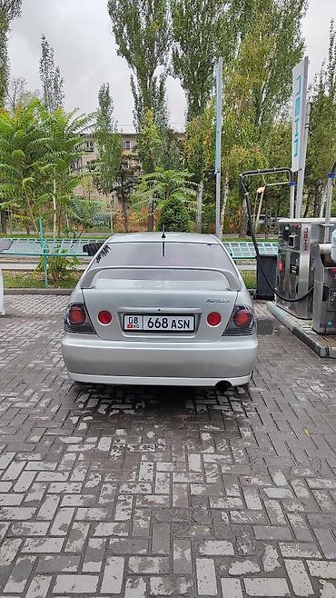 Toyota Altezza седан, правый руль. Цвет серебристый. Комплектация с внешним спорт-обвесом: передний и задний бампер со спойлером-«губой», боковые пороги, задний антикрыло-спойлер. Литые 5‑спицевые диски, окрашенные суппорты. Галогенные фары с противотуманками, повторители поворотов в крыльях. Тонированные стекла, ветровики. Один выхлопной патрубок. Интерьер темный, передние сиденья с выраженной боковой поддержкой (по фото). Автомобиль на регистрационных номерах KG G8: 668 ASN.