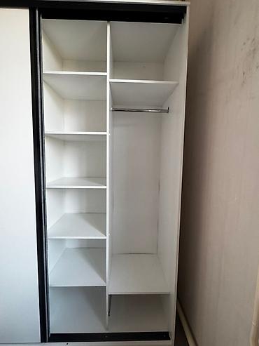 - Внутри: слева секция с полками — 5 открытых полок для одежды, белья и коробок; сверху дополнительная полка.