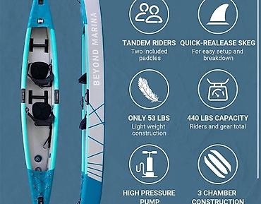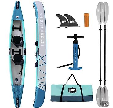В комплекте на фото видны: каяк с установленными точками крепления сидений и багажной резинкой; предусмотрены ручки для переноски и крепеж под плавник. Отличный выбор для семейных водных прогулок и длительных гребных маршрутов.
