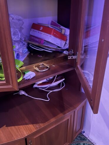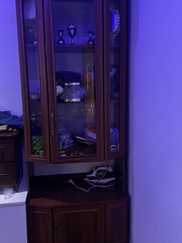 Угловой буфет-витрина из древесного массива/ЛДСП в тёплом оттенке орех.