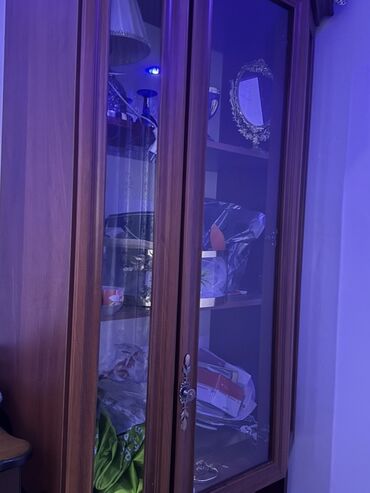 Комплект: нижняя тумба + столешница + верхняя стеклянная витрина. Без дополнительной техники и предметов на полках.