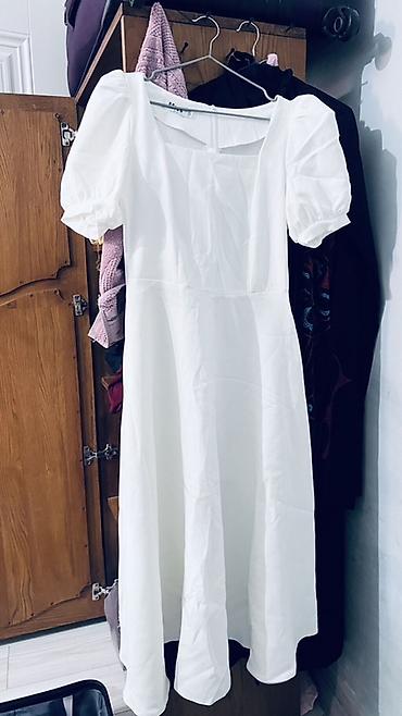 1) Белое платье миди из плотной гладкой ткани: