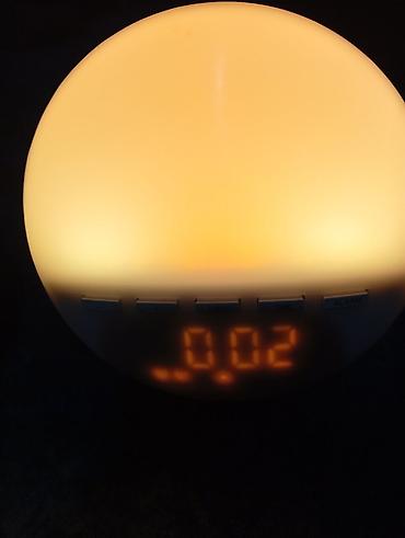 - Круглый светильник с цифровыми часами и будильником на корпусе.