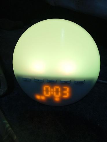 - Круглый светильник с цифровыми часами и будильником на корпусе. -
