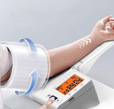 Автоматический тонометр BP-D01 — это настольный прибор для измерения артериального давления на верхней части руки с интегрированной цилиндрической манжетой. Главное отличие модели — измерение без ручного наматывания обычной манжеты: пользователю достаточно разместить прибор на столе, вставить руку в манжету, правильно положить локоть в упор и нажать кнопку запуска. Такой формат делает процесс измерения проще, удобнее и понятнее, особенно для пожилых людей и тех, кому сложно правильно фиксировать классическую манжету.