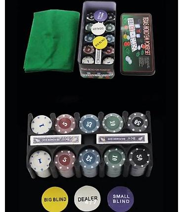 Состав: 200 фишек + 2 пары для покера + кусок скатерти + код дилера/большой блайнд/малый блайнд для каждой,