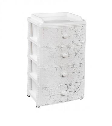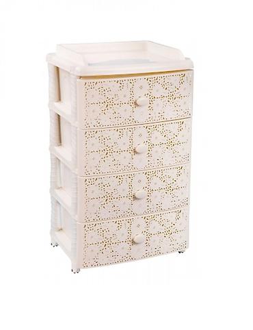 Оригинальный и функциональный комод заслужено пользуется большой популярностью среди наших покупателей. Изделие способно гармонично вписаться в интерьер любой комнаты. Комод произведен из высококачественного и безопасного полипропилена. При производстве используется только сертифицированное и экологически чистое, качественное сырье отечественных и зарубежных производителей. Данное изделие произведено на современном технологичном оборудовании, а потому отличается прочностью и устойчивостью разнообразным механическим воздействиям. Также особую прочность изделию придает цельная конструкция перегородок. Оригинальный внешний вид задает кружевная конструкция поверхности лицевой части ящика. Комод имеет четыре широких выдвижных ящика большой вместимости, в которых будет очень удобно хранить личные вещи и другие принадлежности. Благодаря небольшому весу, комод очень легко передвигается. Комод упаковывается в индивидуальную упаковку, где каждый клиент сможет найти инструкцию по сборке.