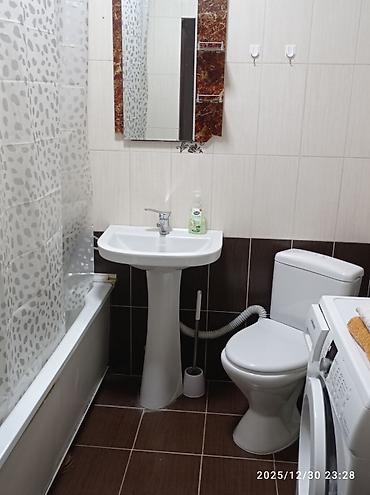 - Санузел совмещённый: ванна с занавеской, умывальник на тумбе-пьедестале, зеркало с полочками, унитаз, стиральная машина-автомат.