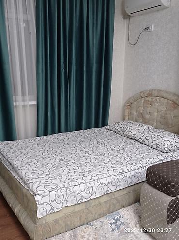 - Комната с двуспальной кроватью, мягким изголовьем, плотными тёмно-зелёными шторами и кондиционером.