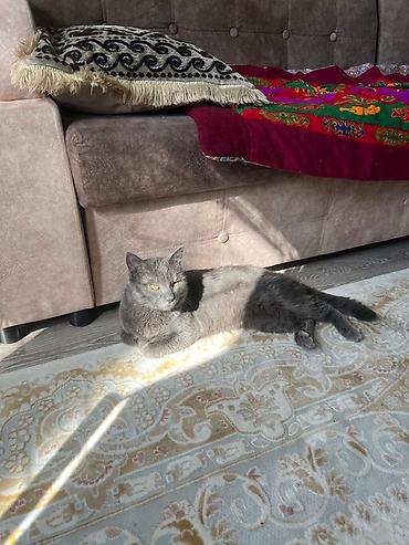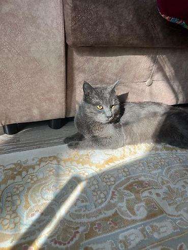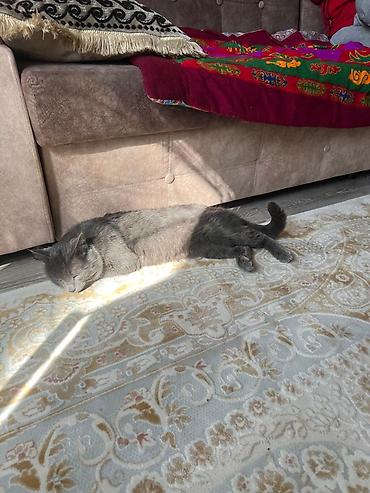 Кошка, окрас: сплошной серый (дымчатый), короткошёрстная. Глаза янтарные, выражение спокойное. Компактное крепкое телосложение, пушистый хвост, аккуратные лапы. На фото видно, что любит солнечные места у окна и на ковре, охотно отдыхает рядом с диваном. Подходит для домашнего содержания: спокойная, уравновешенная, ориентирована на человека, любит наблюдать из окна и греться на солнышке. Отлично впишется в квартиру, где есть подоконник/лежанка у окна и мягкое место для отдыха.