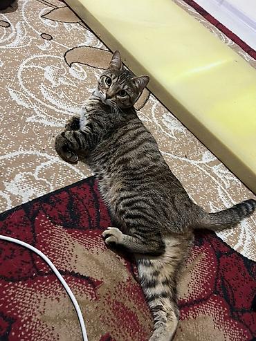 Домашняя кошка, короткошерстная, тигровый окрас (коричневые и серые полосы). Компактного среднего размера, стройная, с выразительными большими янтарными глазами и аккуратными ушками. Лапы крепкие, хвост длинный с тёмными кольцами. Шерсть гладкая, блестящая, с чётким рисунком “табби”.