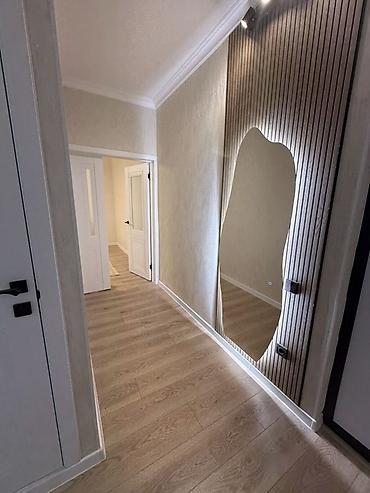 - Коридор с декоративной рейкой и большим фигурным зеркалом с подсветкой; точечные светильники, ламинат, белые межкомнатные двери.