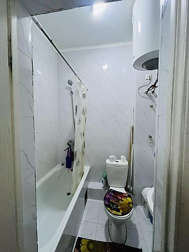 - Санузел совмещённый: ванна с душем и шторкой, унитаз, бойлер для горячей воды, кафель на стенах и полу.