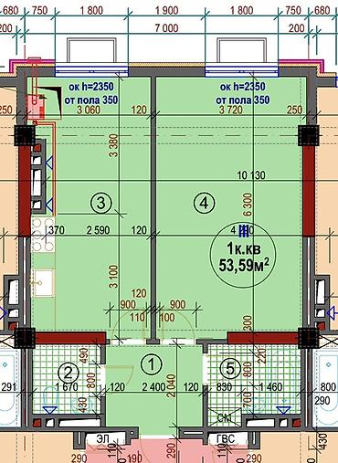 - Окна на сторону Магистрали, высокий уровень естественного освещения; высота оконного проёма ок h=2350 мм, от пола 350 мм