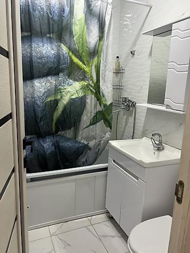 - Санузел совмещённый: ванна с душем и шторкой, умывальник с тумбой и зеркальным шкафом, унитаз; стены и пол в светлой керамической плитке «под мрамор», настенный смеситель, угловая полка.