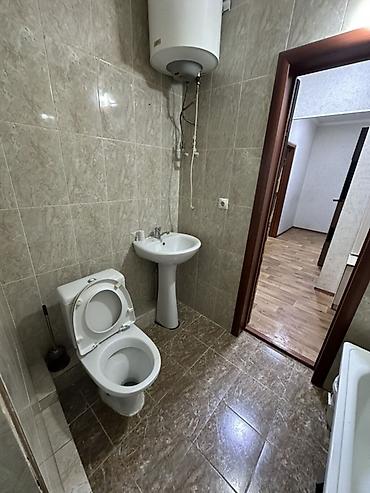 - Санузел совмещённый: ванна стандартного размера с душем, унитаз, раковина на пьедестале, настенный электрический водонагреватель. Стены и пол облицованы керамической плиткой, есть вентиляционная решётка.