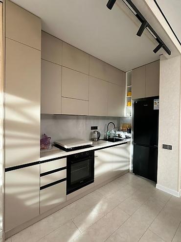 Светлая 1‑комнатная квартира с современной кухней и полной меблировкой. - Гостиная: длинный модульный диван с мягкими подушками, потолочная люстра, плотные шторы, вместительный белый шкаф-купе/шка...