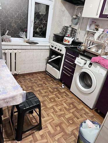 - Кухня с газовой плитой и духовкой, вытяжкой, мойкой, стиральной машиной, навесными и напольными шкафами, столом, стулом/табуретом. ПВХ‑окно, рабочая стенка в плитке, радиатор отопления.