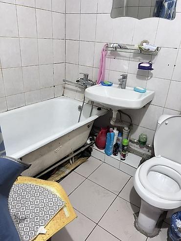 - Санузел совмещенный: ванна, умывальник с полкой и зеркалом, унитаз, пол и стены в плитке.