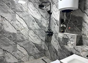 - Современный санузел с душевой зоной, тропическим душем и водонагревателем