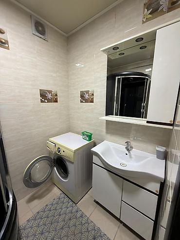 - Санузел с плиткой до потолка, умывальный модуль с тумбой и зеркальным шкафом, вентиляция.