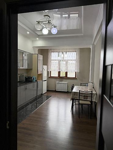 - Отдельная кухня-столовая: линейный гарнитур с большим количеством шкафов, стол и стулья, зонирование пола плиткой у рабочей зоны.