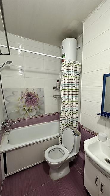 - Санузел совмещённый: ванна с душем, бойлер, раковина с тумбой и зеркалом, пол и стены в плитке.