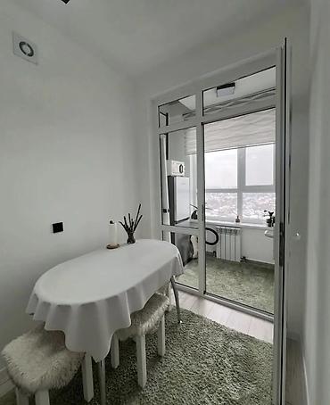 - Кухня-столовая с выходом на застеклённую лоджию через раздвижные стеклянные перегородки. Овальный обеденный стол, стулья/скамьи, зелёные ковры, широкий подоконник, римские шторы, панорамное остекление с видом на город.