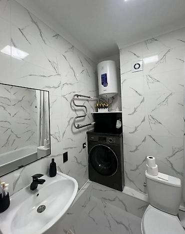 - Санузел совмещённый в плитке «под мрамор»: подвесное зеркало, умывальник с однорычажным смесителем, унитаз, ванна с душем, полотенцесушитель, вытяжка. Установлены стиральная машина и накопительный водонагреватель.