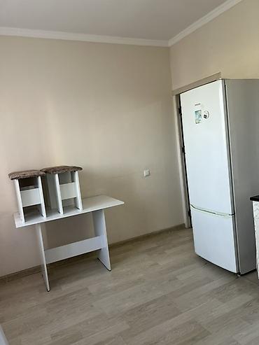 - Кухня с холодильником и обеденным столом, напольное покрытие под светлое дерево.