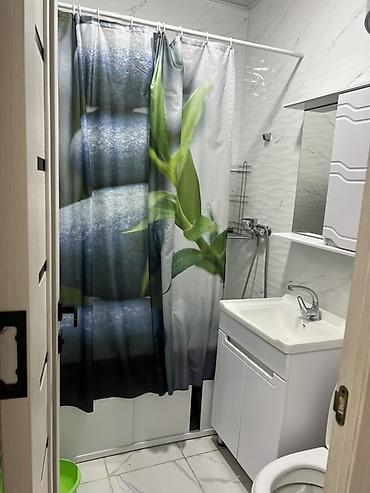 - Санузел совмещённый: ванна/душ с шторкой, умывальник с тумбой и зеркалом, плитка «под мрамор», смеситель с душем.