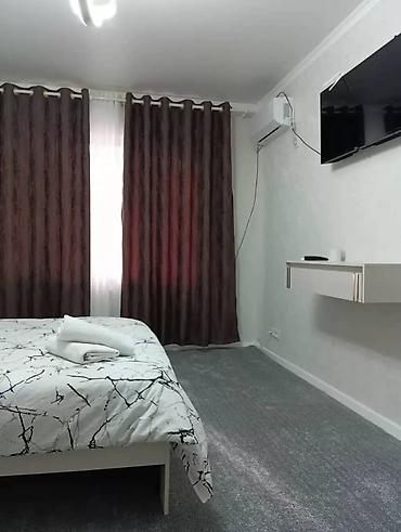 - Спальня/гостиная: двуспальная кровать с матрасом, прикроватные тумбы, туалетный столик с зеркалом-подсветкой, потолочный дизайнерский светильник, плотные шторы блэкаут, ковер, кондиционер, настенный телевизор.