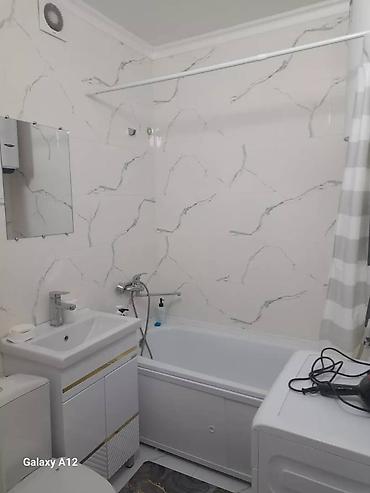 - Санузел совмещённый: ванна, раковина с тумбой, зеркало, унитаз, стиральная машина, душевая лейка, штора для ванны.