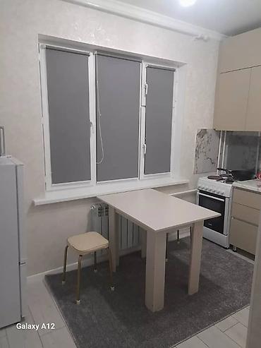 - Кухня: набор шкафов, электрическая плита с духовкой, холодильник, стол и табурет, защитные роликовые шторы на окнах, фартук под мрамор.