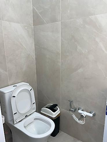 - Санузел отделан крупноформатной плиткой в светлой гамме; установлены унитаз, гигиенический душ, компактная урна.