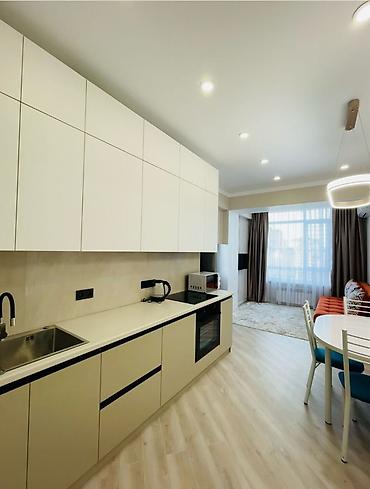 - Кухня-гостиная открытого типа: длинная линейная кухонная гарнитура с верхними и нижними шкафами до потолка, встроенная варочная панель и духовой шкаф, мойка с современным смесителем, вытяжка, электрочайник, микроволновая печь. Обеденная зона со столом и стульями, зона отдыха у окна с диваном. Панорамное окно, плотные шторы. По потолку – точечные светильники и дизайнерская люстра.