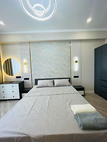 - Просторная светлая спальня с двуспальной кроватью, прикроватными тумбами, мягким изголовьем и декоративной подсветкой. Зеркальный туалетный/рабочий стол с комодом. Текстиль в спокойных тонах, на кровати комплект полотенец/плед.