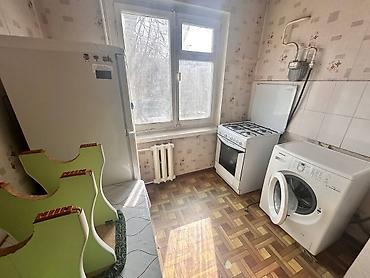 - Кухня с окном: установлены газовая плита с духовкой, холодильник, стиральная машина. Газовый счетчик на стене.