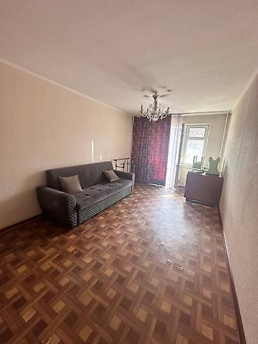 - Просторная жилая комната вытянутой формы; окно и выход на балкон, потолочная люстра, диван, тумба.