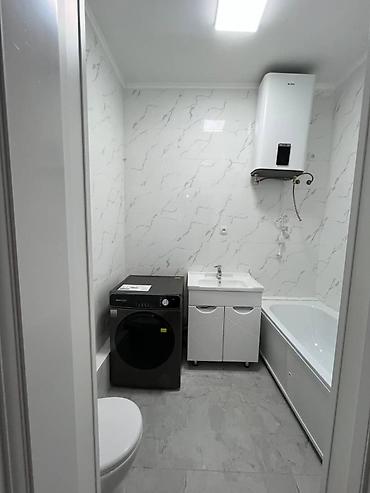 - Ванная комната в светлой керамогранитной плитке: ванна, умывальник с тумбой, унитаз, электрический водонагреватель и фронтальная стиральная машина.