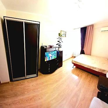 - Просторная комната: двуспальная кровать, раскладное кресло, шкаф‑купе, тумба с телевизором, кондиционер, шторы блэкаут.
