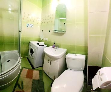 - Санузел совмещённый: душевая кабина, раковина с тумбой и зеркалом, унитаз, стиральная машина, полочка и крючки, коврик.