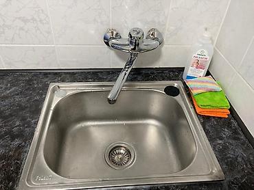 - Ванная зона отделана плиткой, на кухонном фартуке — керамическая плитка