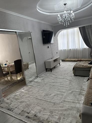 - Просторная гостиная с большим угловым диваном, нишей с декоративной штукатуркой и потолочной люстрой. Настенное ТВ, аккуратная ТВ-тумба, панорамное зеркало-купе, арочные проемы.