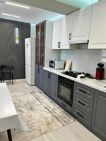 - Просторная кухня‑столовая с длинной рабочей зоной и обеденным столом.